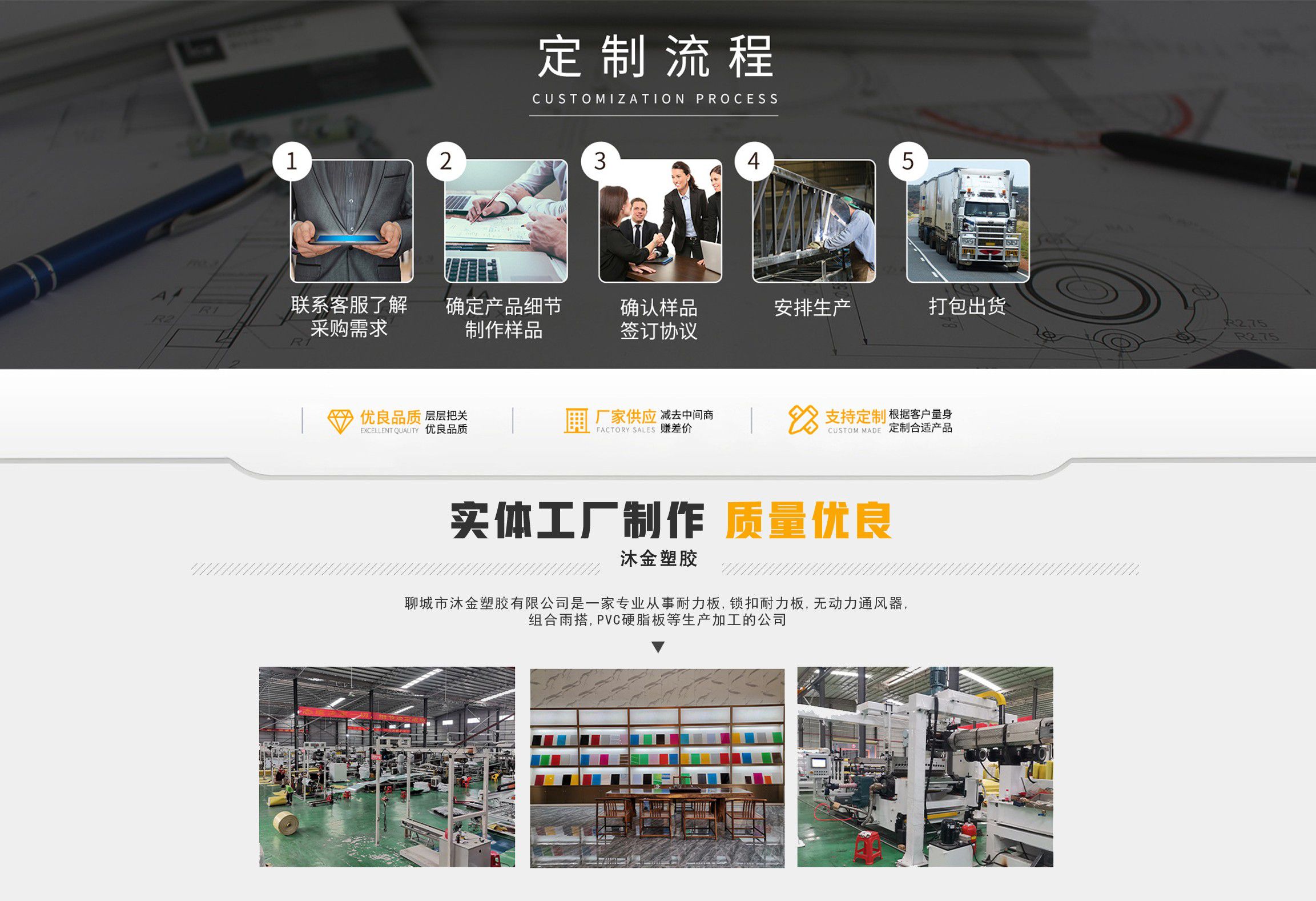 聊城市沐金塑膠有限公司注冊資金2180萬元,占地20000余平方,擁有自建廠房15000平方,員工100余名。10余年來,公司主營耐力板,鎖扣耐力板,耐力板深加工,無動力通風器,組合雨搭,PVC硬脂板,耐力板廠家等板材的發展戰略,逐漸成長為綜合性企業?! 」緭碛卸鄺l板材共擠生產線,采用世界知名品牌進口原材料和先進工藝,依據完善的ISO9001質量管理體系和ISO14001環境管理體系,為產品的卓越品質提供了強有力的保證。憑借過硬的創新能力和堅實的硬件基礎,贏創已成為國內領先的熱塑性板材生產商,產品被廣泛應用于建筑業、農業、工業、廣告業、安防行業及DIY領域?! 」臼冀K致力于通過提供最優的板材應用解決方案,為客戶創造最高的價值;堅守創新、質量、靈活、服務和速度的核心價值觀;堅持“完美的產品需要完美服務的支持”的經營理念,努力實現成為世界領先的板材與解決方案供應商的夢想?! ≡谖磥恚緦⒘⒆憧蛻粜枨?,不斷改變和完善現有產品,拓展產品線和充分開發板材的應用領域,為客戶創造全方位的價值。同時更好地實現員工的價值,實現公司團隊的價值。我們將與您一起創贏未來! 企業使命:成為世界領先的板材與解決方案供應商?! 」驹妇埃和ㄟ^提供最優的板材應用解決方案,為客戶創造最高的價值。 核心價值觀:質量...